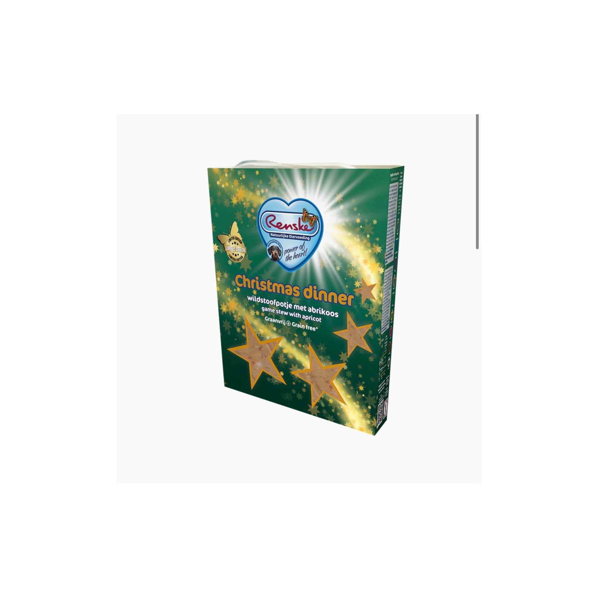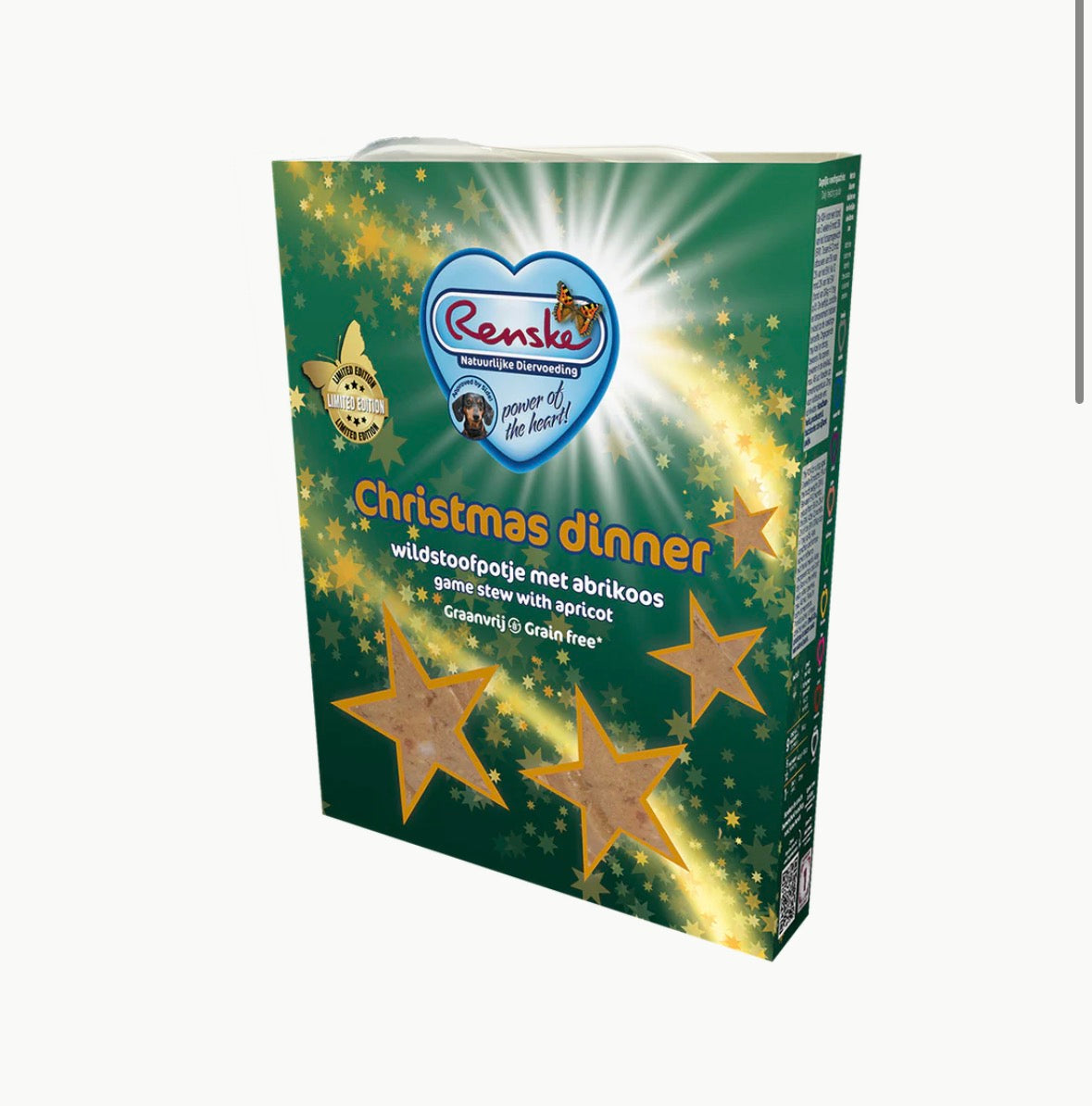 Renske Vers Gestoomde Vlees Maaltijd Kerstdiner is een maaltijd voor jonge en volwassen honden van alle rassen vanaf 9 weken. Het feestelijke product bevat 75% vers gestoomde eend en hert en is aangevuld met onder andere sperziebonen, abrikoos, gedroogd zeewier en gedroogde kruiden.